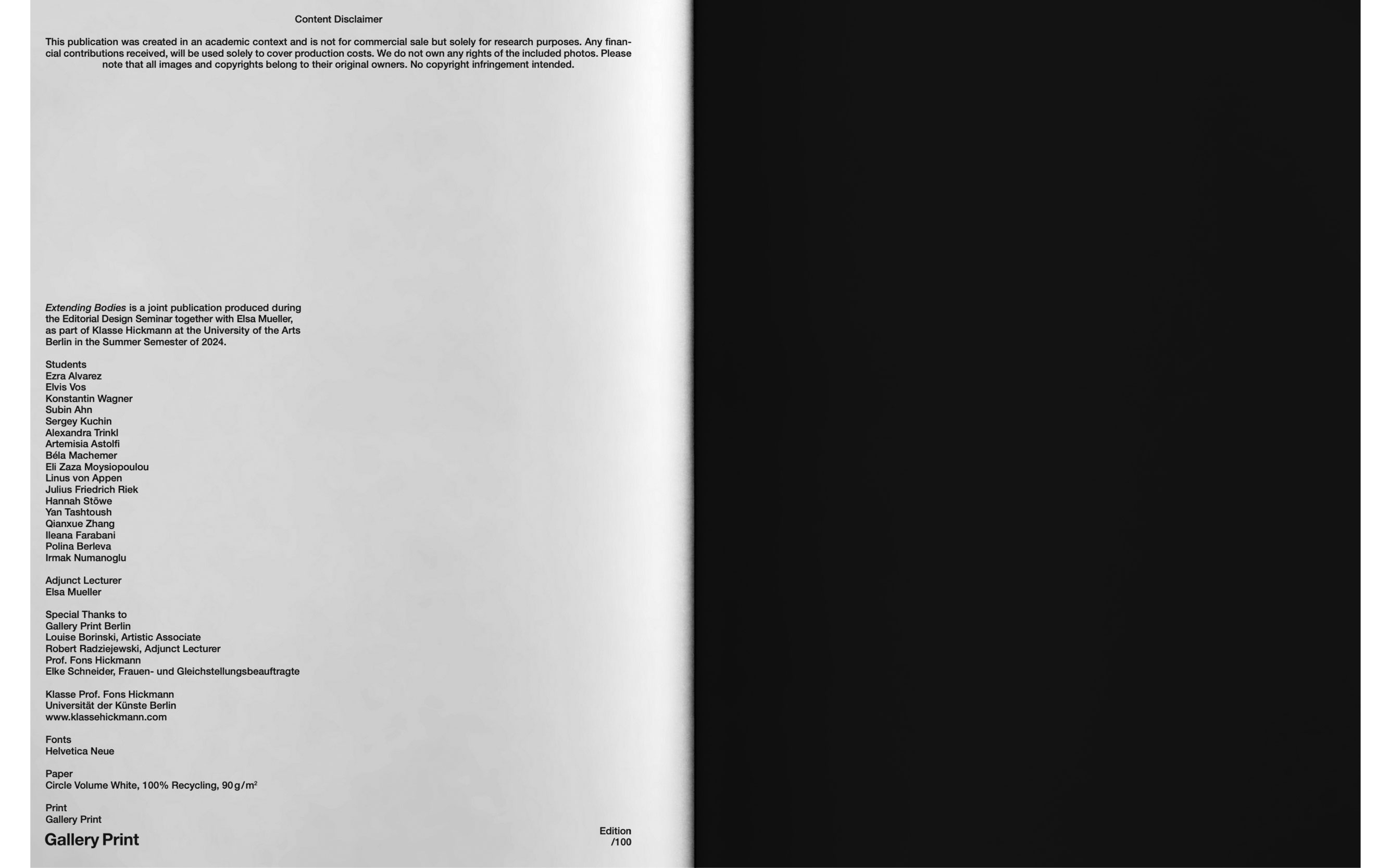 The publication was produced together with a cohort of 17 students and associate lecturer Elsa Mueller as part of the Editorial Design Seminar at the University of the Arts Berlin during the Summer Semester 2024.